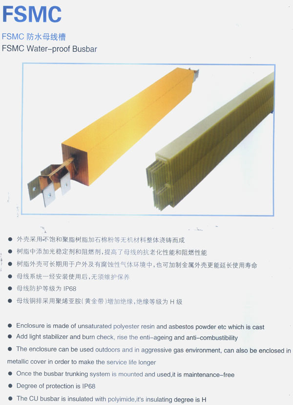 FSMC防水性母線槽外殼采用不飽和聚脂樹脂加石棉粉等無機(jī)材料整體澆鑄而成;樹脂中添加光穩(wěn)定劑和阻燃劑,提高了母線的抗老化性能和阻燃性能;樹脂外殼可長(zhǎng)期用于戶外及有腐蝕性氣體環(huán)境中,也可加制金屬外殼更能延長(zhǎng)使用壽命;母線系統(tǒng)一經(jīng)安裝使用后,無須維護(hù)保養(yǎng);母線防護(hù)等級(jí)為|P68;母線銅排采用聚烯亞胺(黃金帶)增加絕緣,絕緣等級(jí)為H級(jí)。